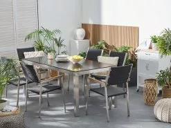 Poikkeuksellinen puutarhakalustesetti, joka luo ainutlaatuisen ilmeen mihin tahansa puutarhaan. Kalusteiden rungot on valmistettu vankasta ja kestävästä ruostumattomasta teräksestä, joka takaa, että setti pysyy upeana pitkään. Hopea runko korostaa luonnollista eukalyptuspuutasoa kauniisti. Pinottavien tuolien selkänojat ja istuinosat ovat UV-kestävää valkoista polyesteriä, joka täydentää pöytää täydellisesti. Säänkestävien materiaalien yhdistelmä antaa ulkoruokailuryhmälle modernin ilmeen. Setti tarjoaa tilaa jopa 6 hengelle, jonka ansiosta se on täydellinen lisä kesän puutarhajuhliin.