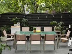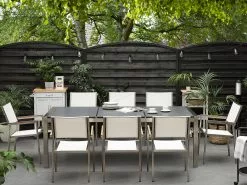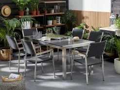 Poikkeuksellinen puutarhakalustesetti, joka luo ainutlaatuisen ilmeen mihin tahansa puutarhaan. Kalusteiden rungot on valmistettu vankasta ja kestävästä ruostumattomasta teräksestä, joka takaa, että setti pysyy upeana pitkään. Hopea runko korostaa mustaa karkaistua lasitasoa kauniisti. Pinottavien tuolien selkänojat ja istuinosat ovat UV-kestävää mustaa polyrottinkia, joka täydentää pöytää täydellisesti. Säänkestävien materiaalien yhdistelmä antaa ulkoruokailuryhmälle modernin ilmeen. Setti tarjoaa tilaa jopa 6 hengelle, jonka ansiosta se on täydellinen lisä kesän puutarhajuhliin.