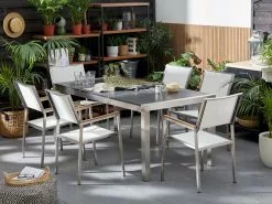 Poikkeuksellinen puutarhakalustesetti, joka luo ainutlaatuisen ilmeen mihin tahansa puutarhaan. Kalusteiden rungot on valmistettu vankasta ja kestävästä ruostumattomasta teräksestä, joka takaa, että setti pysyy upeana pitkään. Hopea runko korostaa mustaa poltettua graniittitasoa kauniisti. Pinottavien tuolien selkänojat ja istuinosat ovat UV-kestävää mustaa polyrottinkia, joka täydentää pöytää täydellisesti. Säänkestävien materiaalien yhdistelmä antaa ulkoruokailuryhmälle modernin ilmeen. Setti tarjoaa tilaa jopa 8 hengelle, jonka ansiosta se on täydellinen lisä kesän puutarhajuhliin.